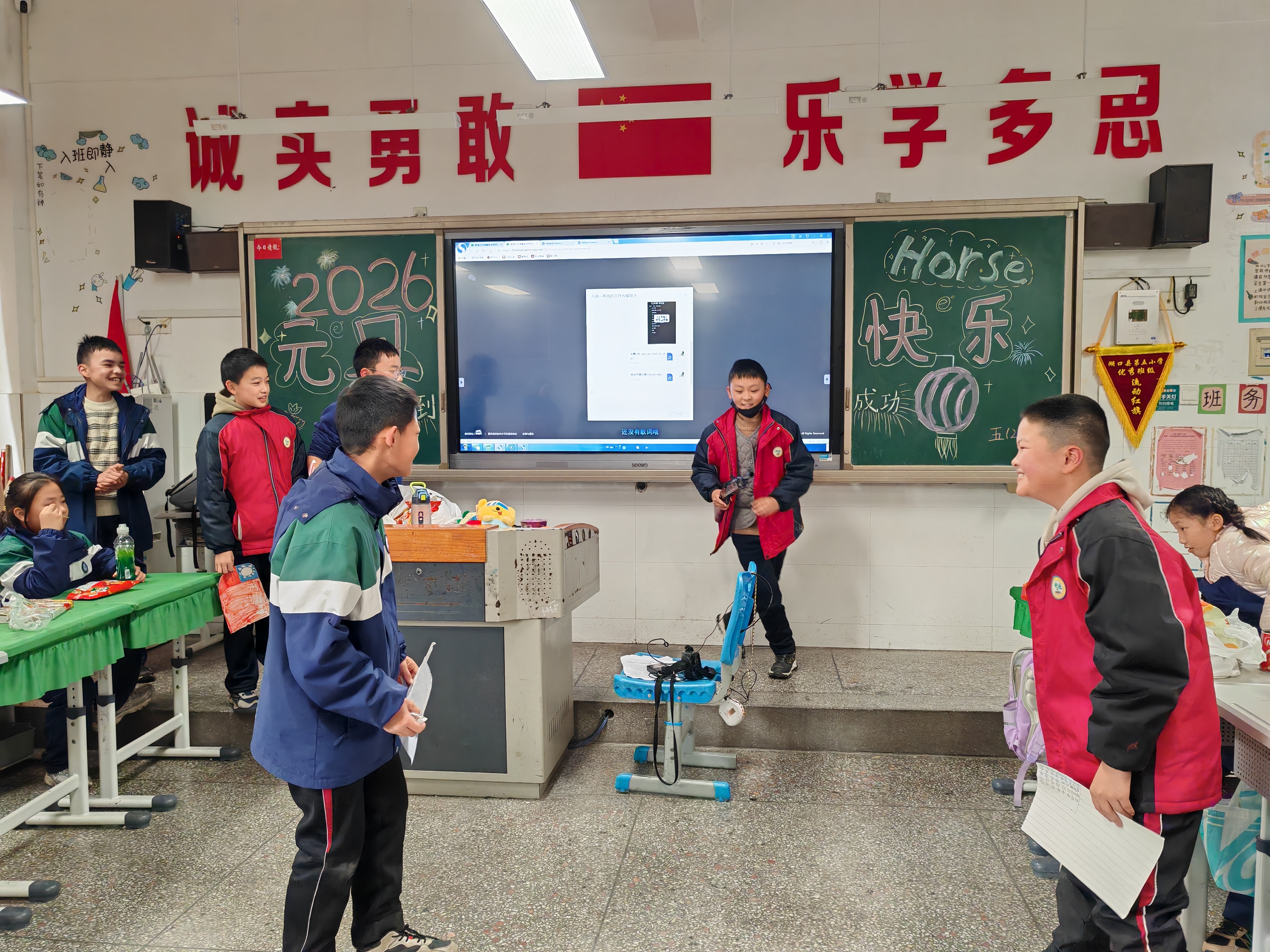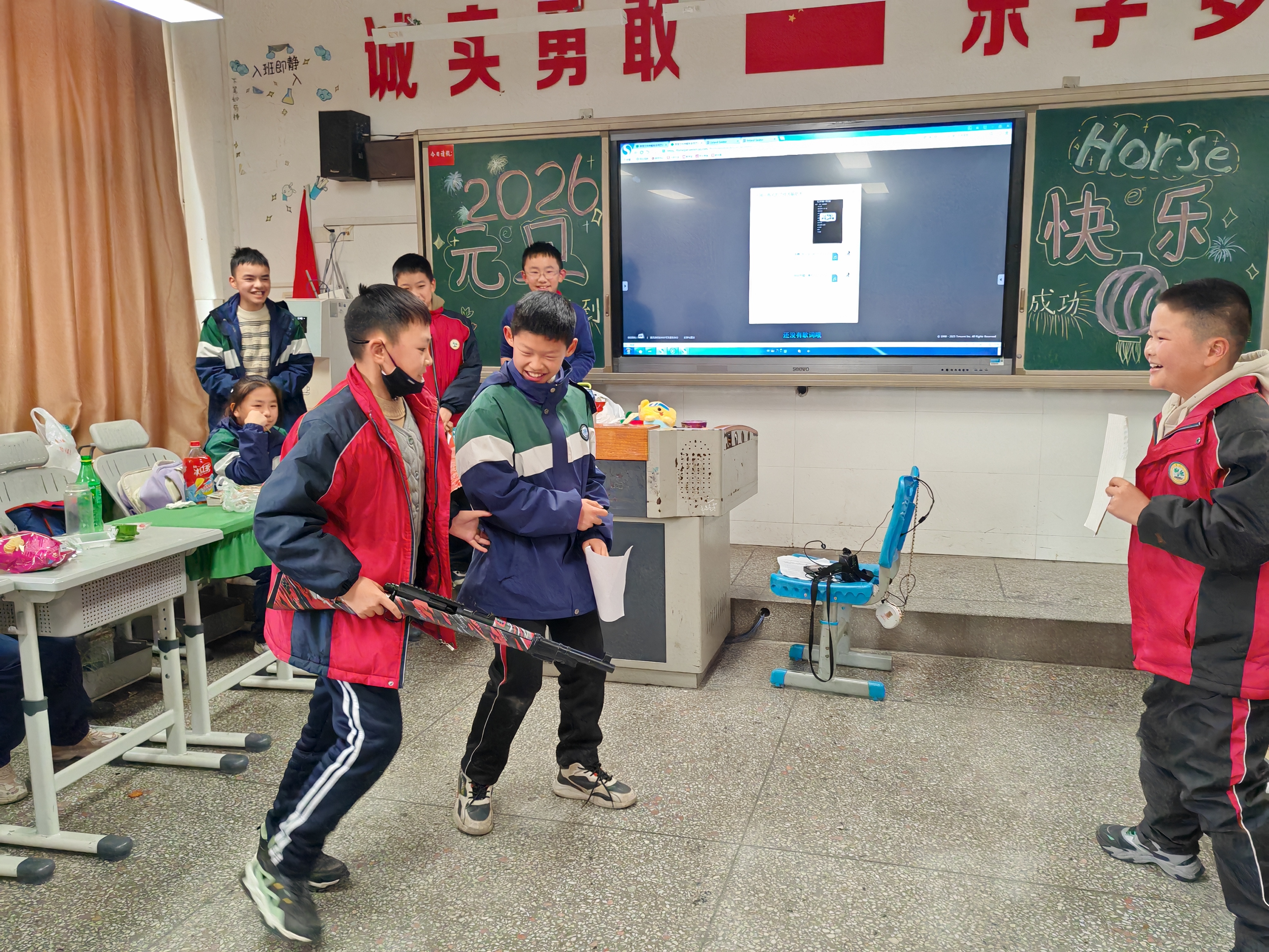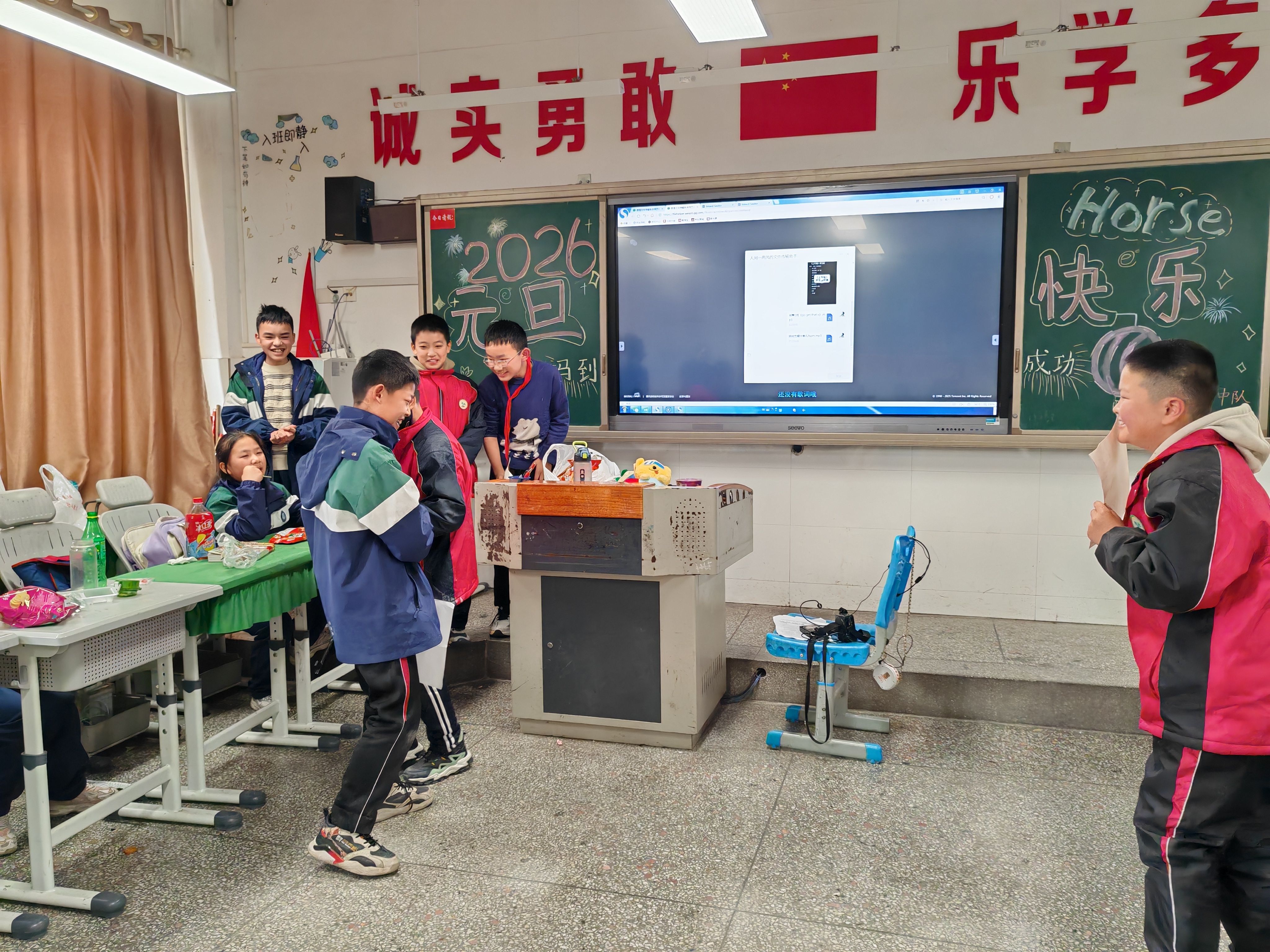 下午1点,是熊老师上午休。席老师让金芮希和廖杨梓来画黑板报,主题是“2026元旦快乐”。午休之后,晚会开始。大家把桌子都搬到了教室三旁(讲台上不放,所以是三旁),教室中间的空地就用来表演节目。