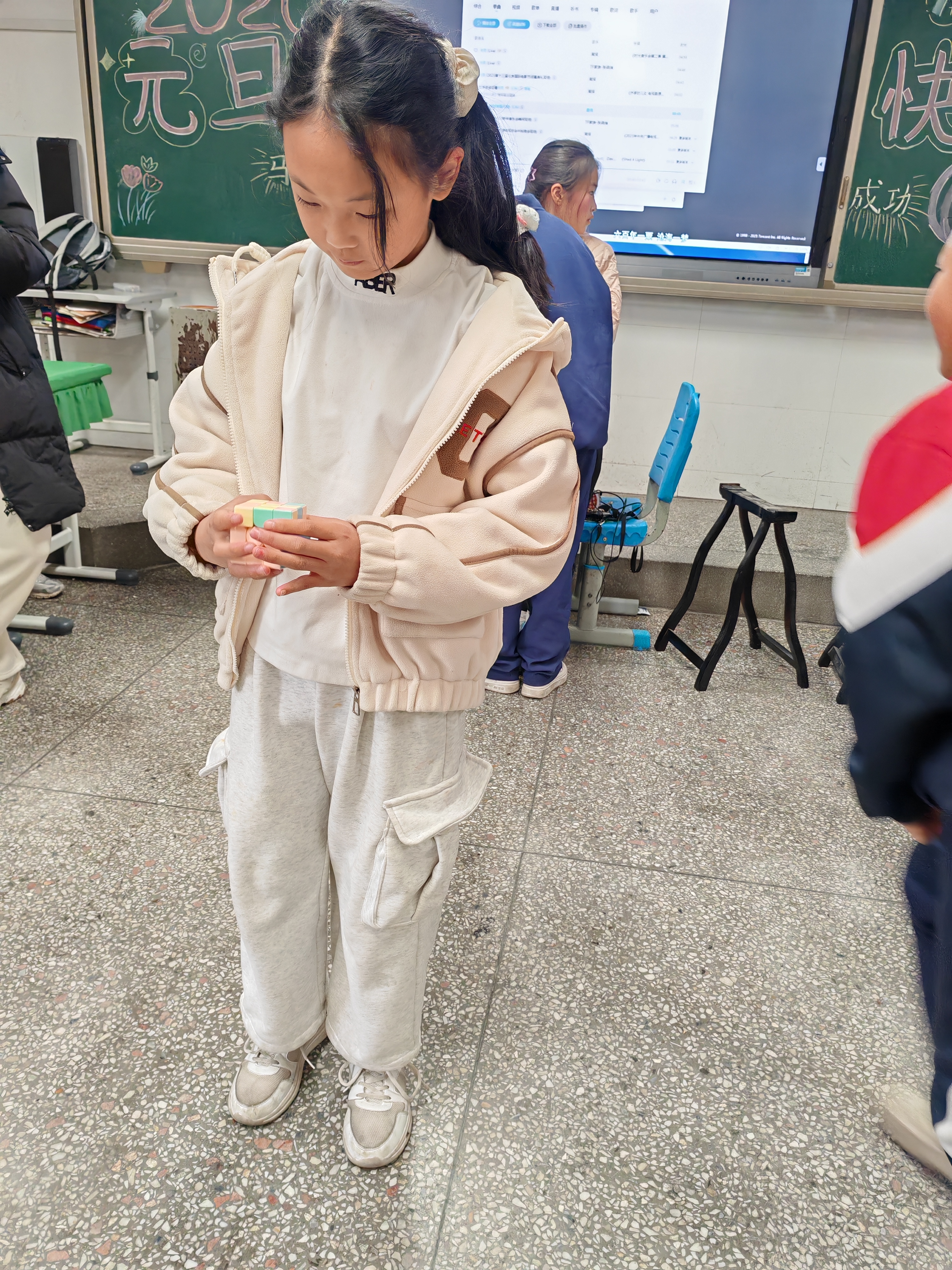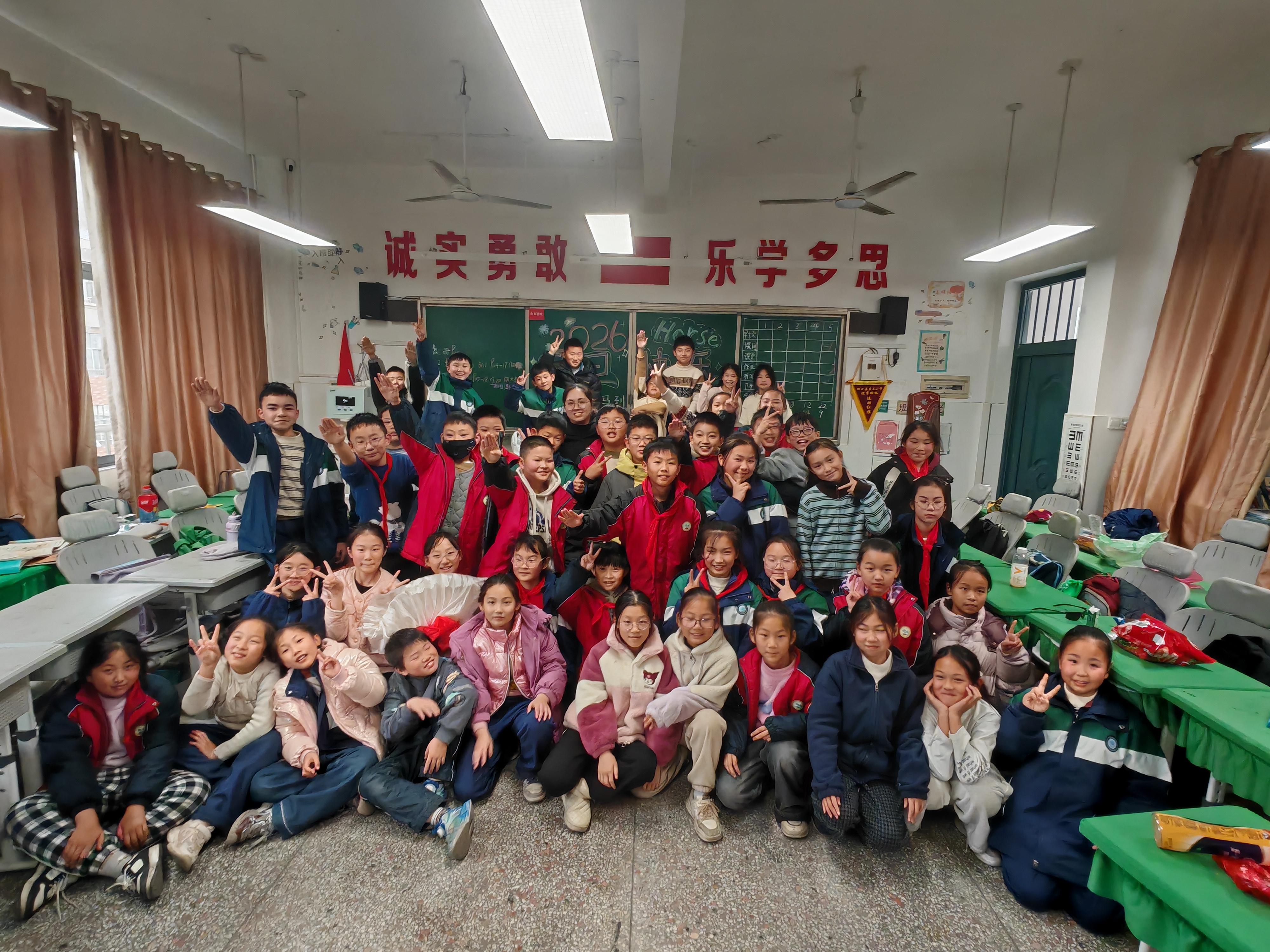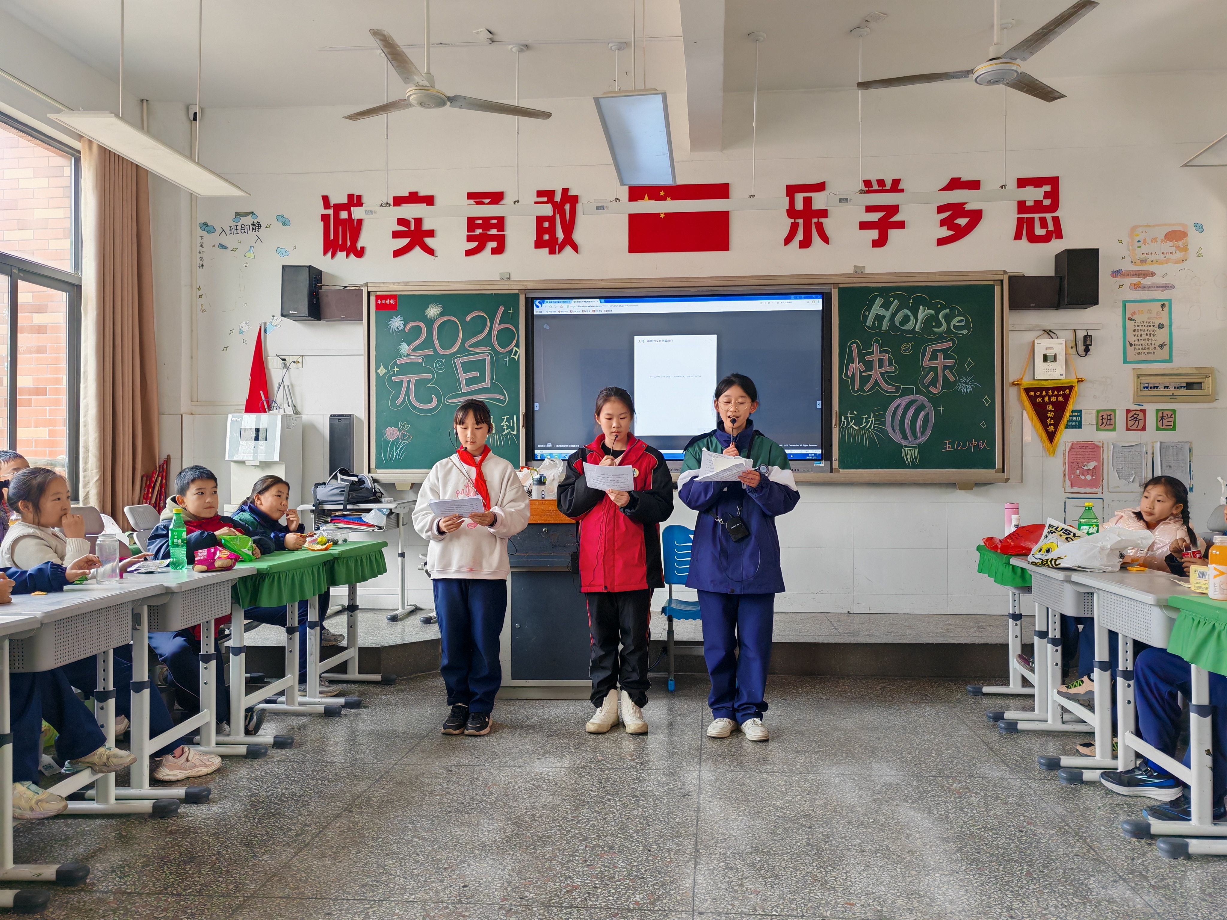 下午1点,是熊老师上午休。席老师让金芮希和廖杨梓来画黑板报,主题是“2026元旦快乐”。午休之后,晚会开始。大家把桌子都搬到了教室三旁(讲台上不放,所以是三旁),教室中间的空地就用来表演节目。