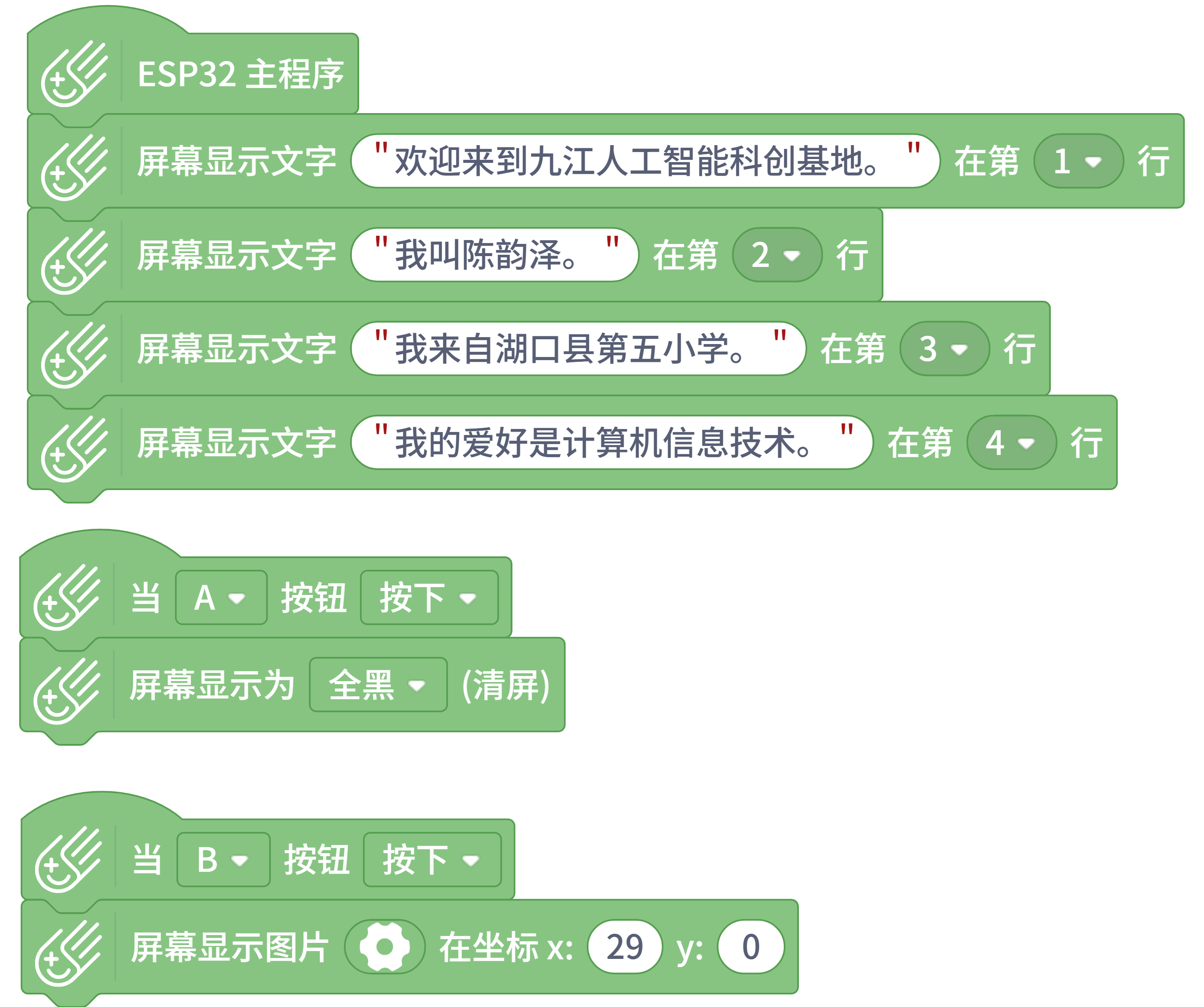 于是,我便在掌控板屏幕第1行上显示了“欢迎来到九江人工智能科创基地”,第2行上显示了“我叫陈韵泽”,第3行上显示了“我来自湖口县第五小学”,第4行上显示了“我的兴趣爱好是编程”。