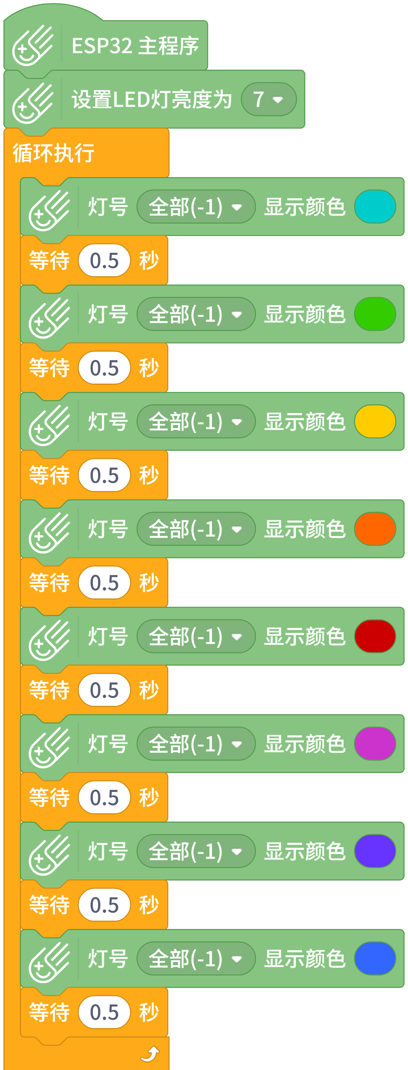 然后我也编了一个流水灯程序,上传到了掌控板上。